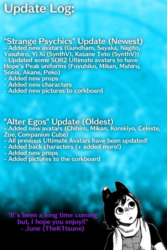 Hello there! Welcome to the "Hope's Peak Role Call" Project page!This project is made from TheK1tsune's Danganronpa series of avatars, also known as...THE ULTIMATE SERIESThis project and avatars are a love letter to the VRChat Danganronpa community, as well as for the series as a whole. The project's goal is to make high quality avatars that are jammed packed with references to the games, as well as the DR community's works and memes.Check below for updates and more avatars!